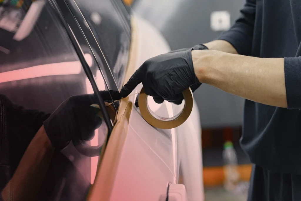Alle Bereiche, die nicht lackiert werden sollen, werden präzise abgeklebt. Dazu gehören Scheiben, Dichtungen, Reifen, Embleme und Innenräume. Saubere Maskierung verhindert Lacknebel an falschen Stellen.